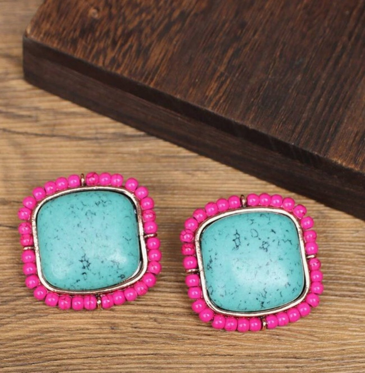 Make a bold impression with these stunning, statement earrings. Featuring a large, square-cut genuine turquoise-colored stone at the center, each piece is meticulously framed by a double row of vibrant,... View full product details