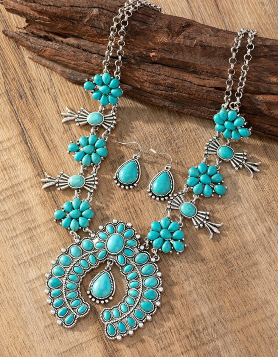 Celebrate classic Western elegance with this Squash Blossom Faux Turquoise Earring Set. The 24-inch necklace showcases a striking squash blossom design adorned with vibrant faux turquoise stones, capturing the rich... View full product details